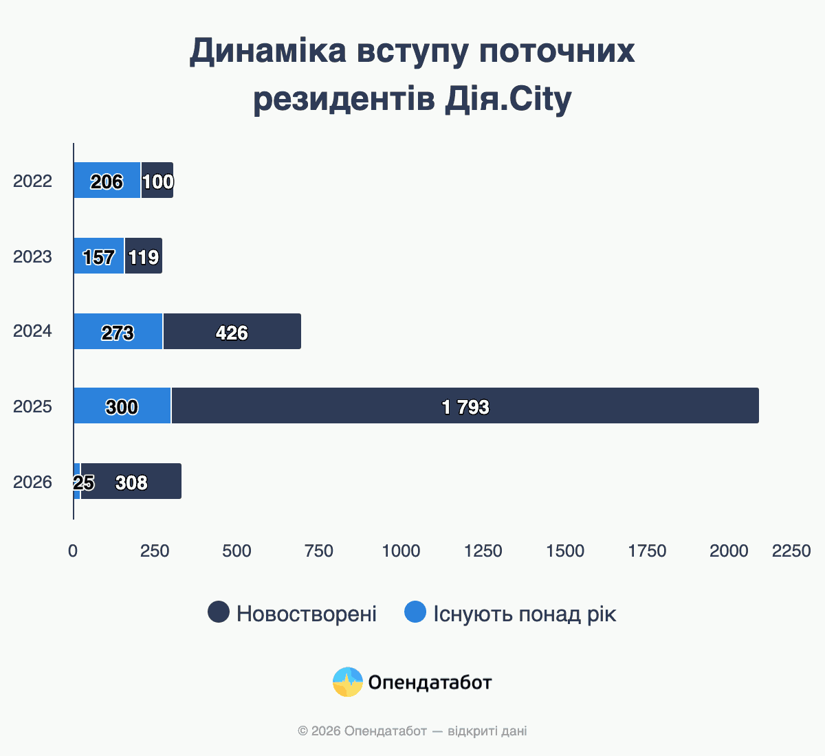 Портрет резидента за роки роботи Дія.City кардинально змінився. На старті у 2022 році більшість вступників були зрілими бізнесами — лише третина з них працювала менш як рік до моменту вступу. Натомість наразі 87% нових резидентів — це новостворені компанії.