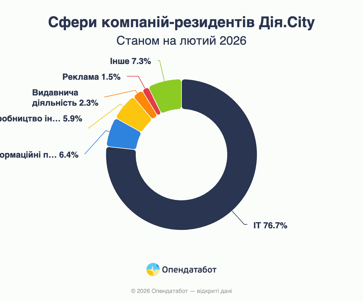 Попри різноманіття напрямів, ядром Дія.City залишається ІТ. Так, 2 844 компанії працюють саме в цій сфері — це 77% усіх резидентів. Далі йдуть інформаційні послуги (6%) та виробництво іншого транспорту (6%). У 2023 році частка айті тимчасово скоротилась з 80% до 63%, водночас зросла присутність компаній із виробництва інших транспортних засобів — до 13%. Втім вже у 2025–2026 роках ІТ знову займає 80% серед нових учасників, натомість частка транспортної сфери зменшилась до 5%.