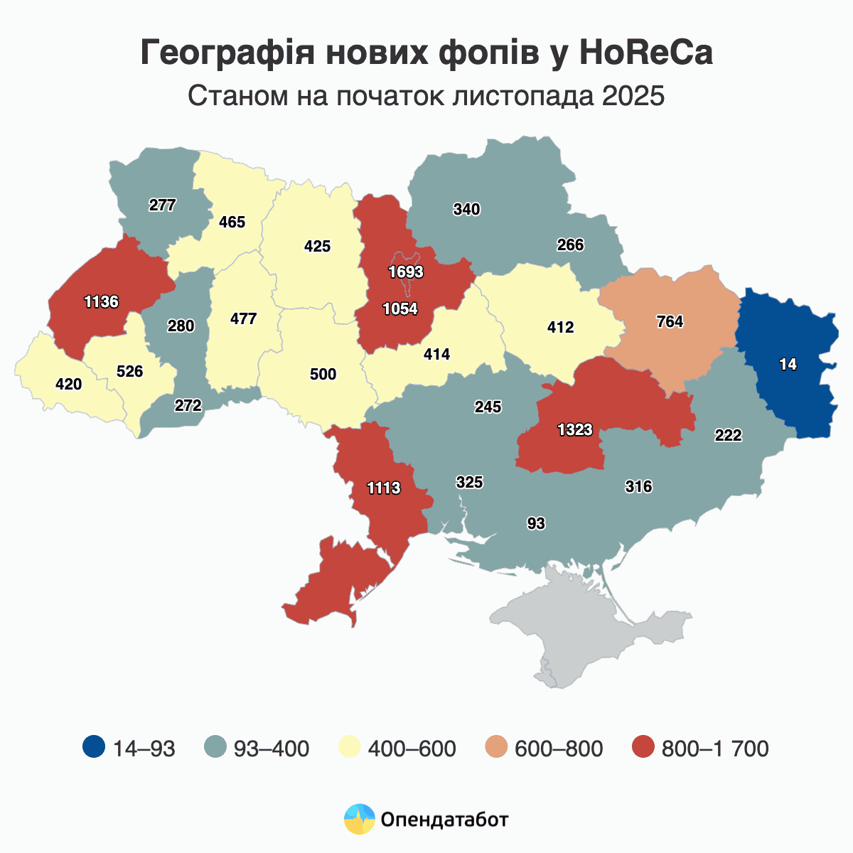 Найбільше нових ФОПів у HoReCa цьогоріч відкрили в Києві (1 693), на Дніпропетровщині (1 323), Львівщині (1 136), Одещині (1 113) та Київщині (1 054).