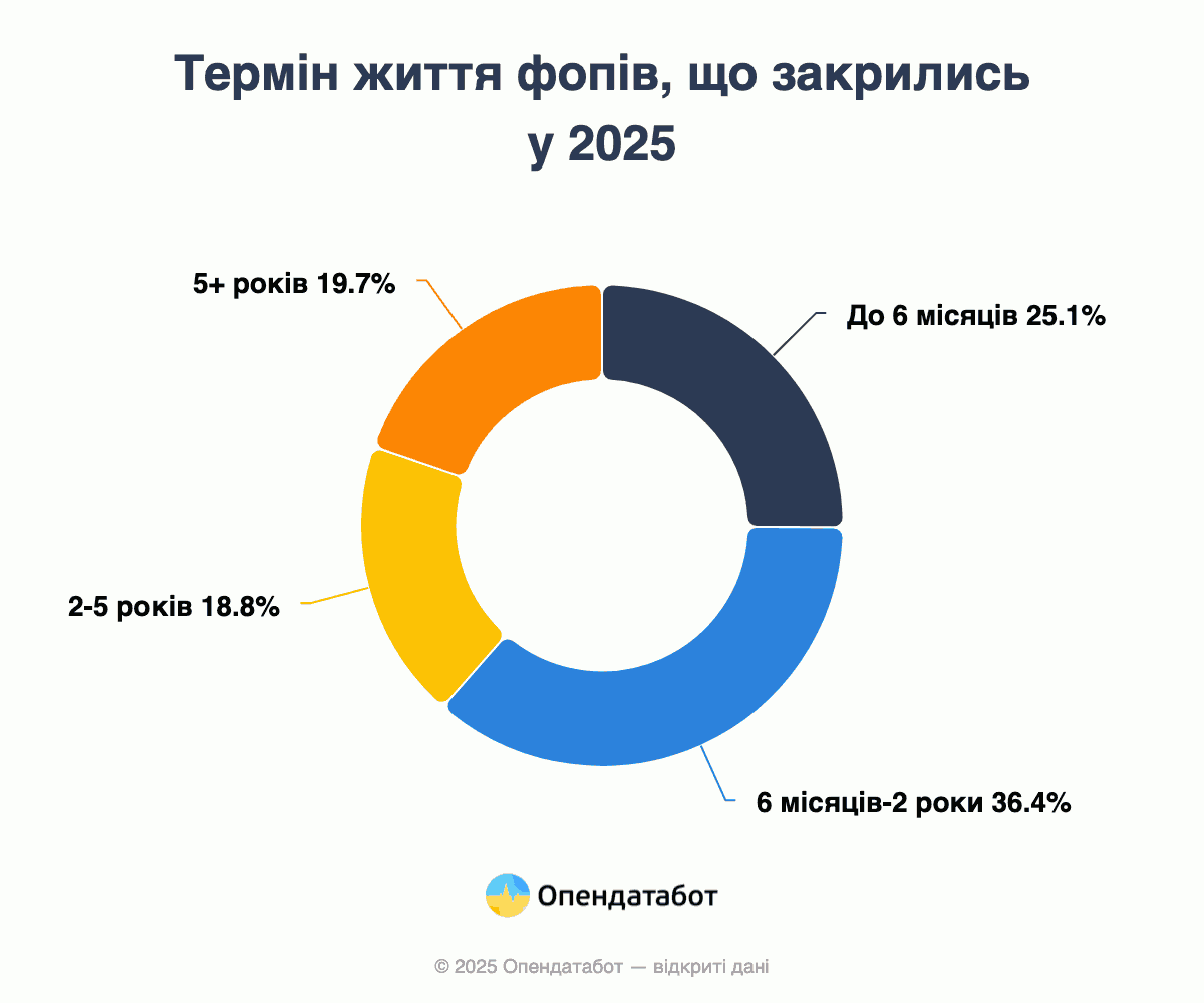 Чверть закритих цьогоріч ФОПів пропрацювала менш ніж пів року. Загалом медіана життя малого та середнього бізнесу у HoReCa — 17 місяців. Найстаріший ресторанний ФОП, який припинив діяльність цьогоріч, працював ще з 1992-го.
