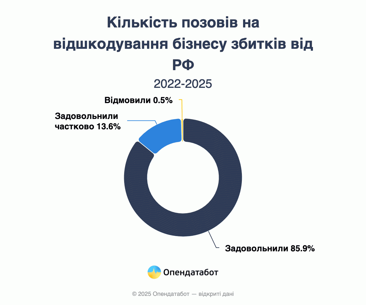 Загалом з початку вторгнення по Україні винесено 639 рішень щодо відшкодування збитків. З них переважна більшість — 549 — задоволено повністю, ще 87 — частково. Лише три позови (0,5%) отримали відмову, всі вони — у Києві у 2024 році. Найбільший відхилений позов стосувався понад 61 млн грн збитків: суд вирішив, що компанія не довела прямого зв’язку між діями РФ та втратою активів у Криму.