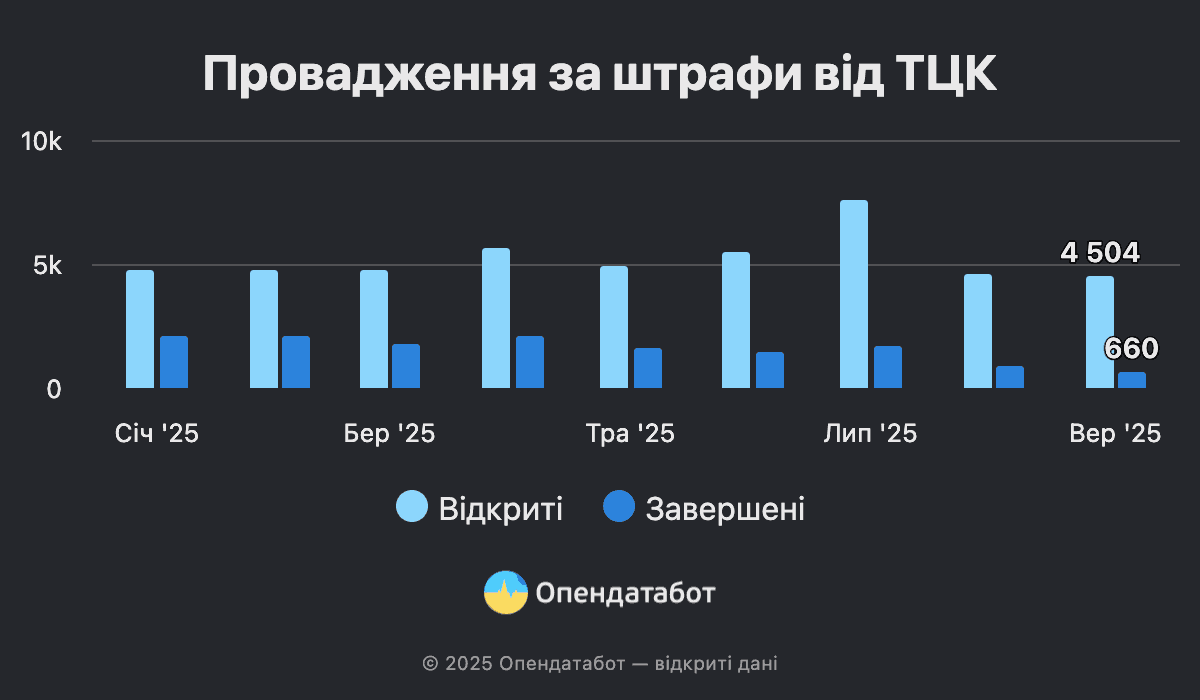 В середньому, щомісяця ТЦК відкривають по 4,5 тисячі нових проваджень. Однак липень став рекордним — 7 595 відкриттів. Левова частка липневих штрафів припала на столицю: 26% або 1 999 проваджень.