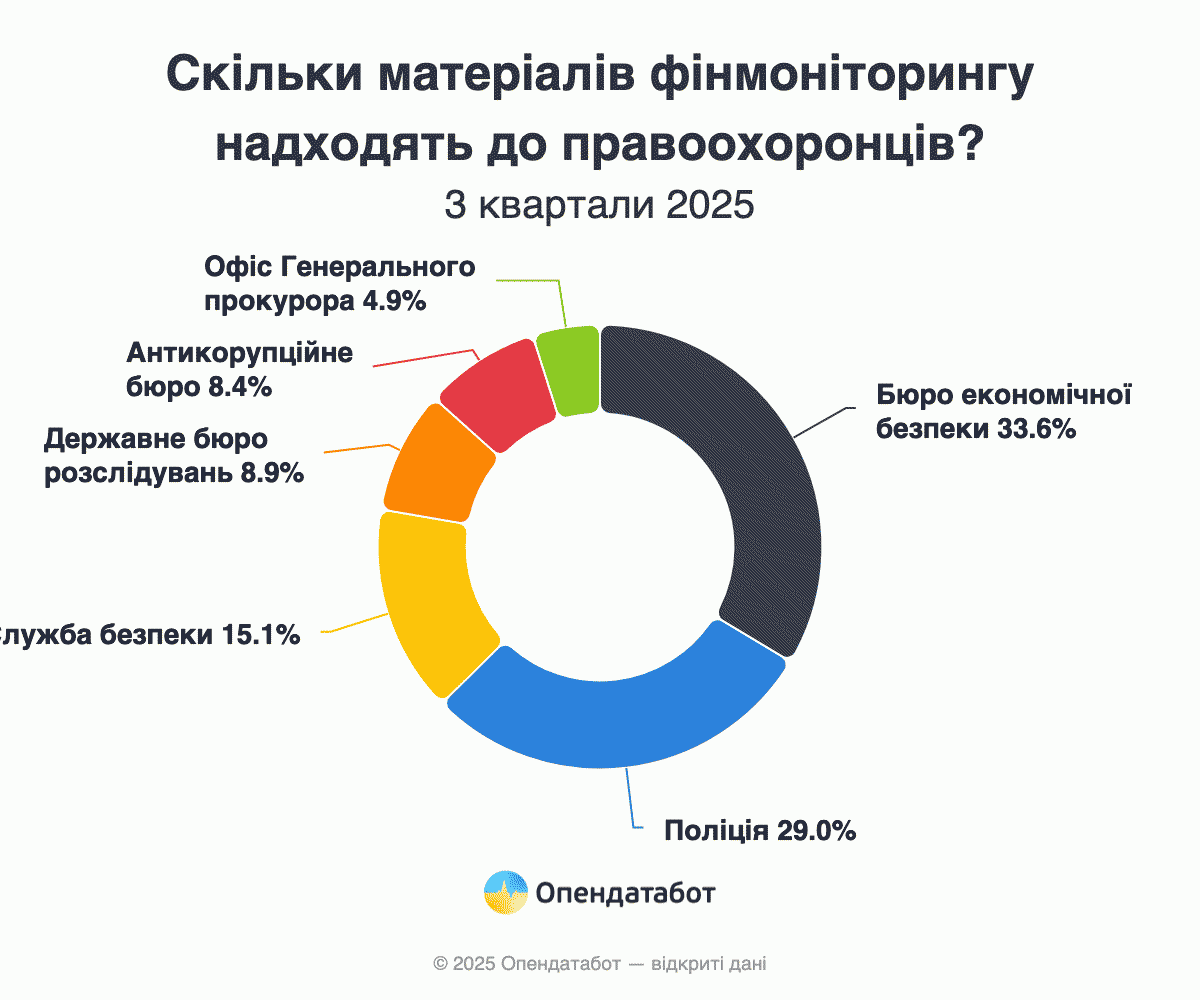 Найбільше фінмоніторинг завантажив роботою Бюро економічної безпеки України: до них направлено понад третину матеріалів з усього обсягу на загальну суму 99,3 млрд грн. До решти правоохоронців пішли повідомлення на значно скромніші суми: