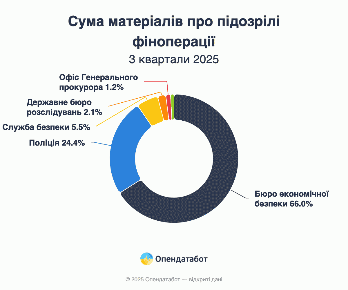 Понад 1,4 млн повідомлень про фінансові операції, що підлягають фінмоніторингу, надійшло до Державної служби фінансового моніторингу за три квартали 2025 року. Це на 10% більше, ніж за аналогічний період торік. Переважна більшість — 83% повідомлень — стосуються порогових операцій. Загалом 794 матеріали на суму 150,46 млрд грн було передано до правоохоронних органів для розслідування. Понад третину з них отримало Бюро економічної безпеки України.