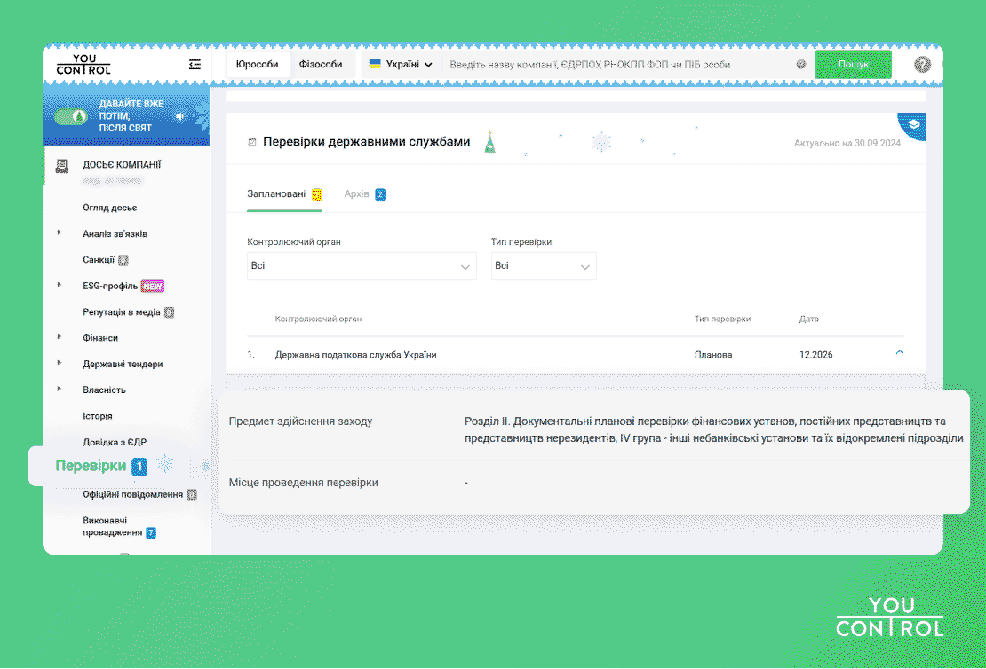 З’ясувати, чи підпадає компанія під планові перевірки від ДПС і коли це відбудеться, можна в системі YouControl. Для цього варто звернути увагу на блок «Перевірки» у досьє компанії в лівому боковому меню.