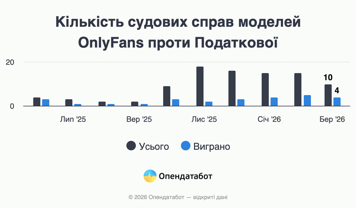 Кількість судових рішень на користь авторів контенту OnlyFans, які оскаржують штрафи та донарахування від Податкової стрімко зростає за даними пошуковика по судових рішеннях «Бабуся». Щонайменше 27 справ завершилися повністю або частково на користь позивачів. Це майже третина від 94 випадків, де моделі намагалися відстояти свої права.
