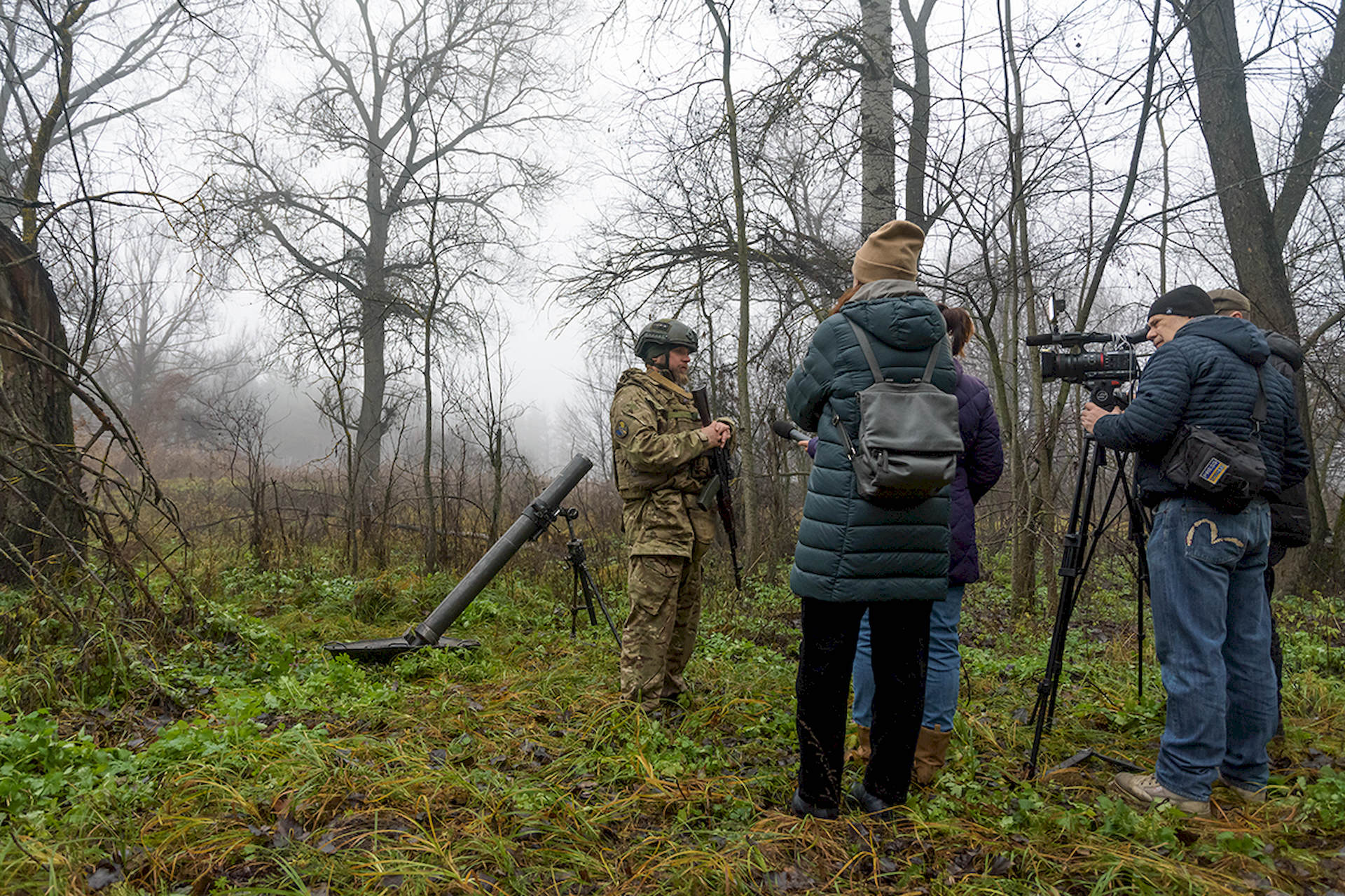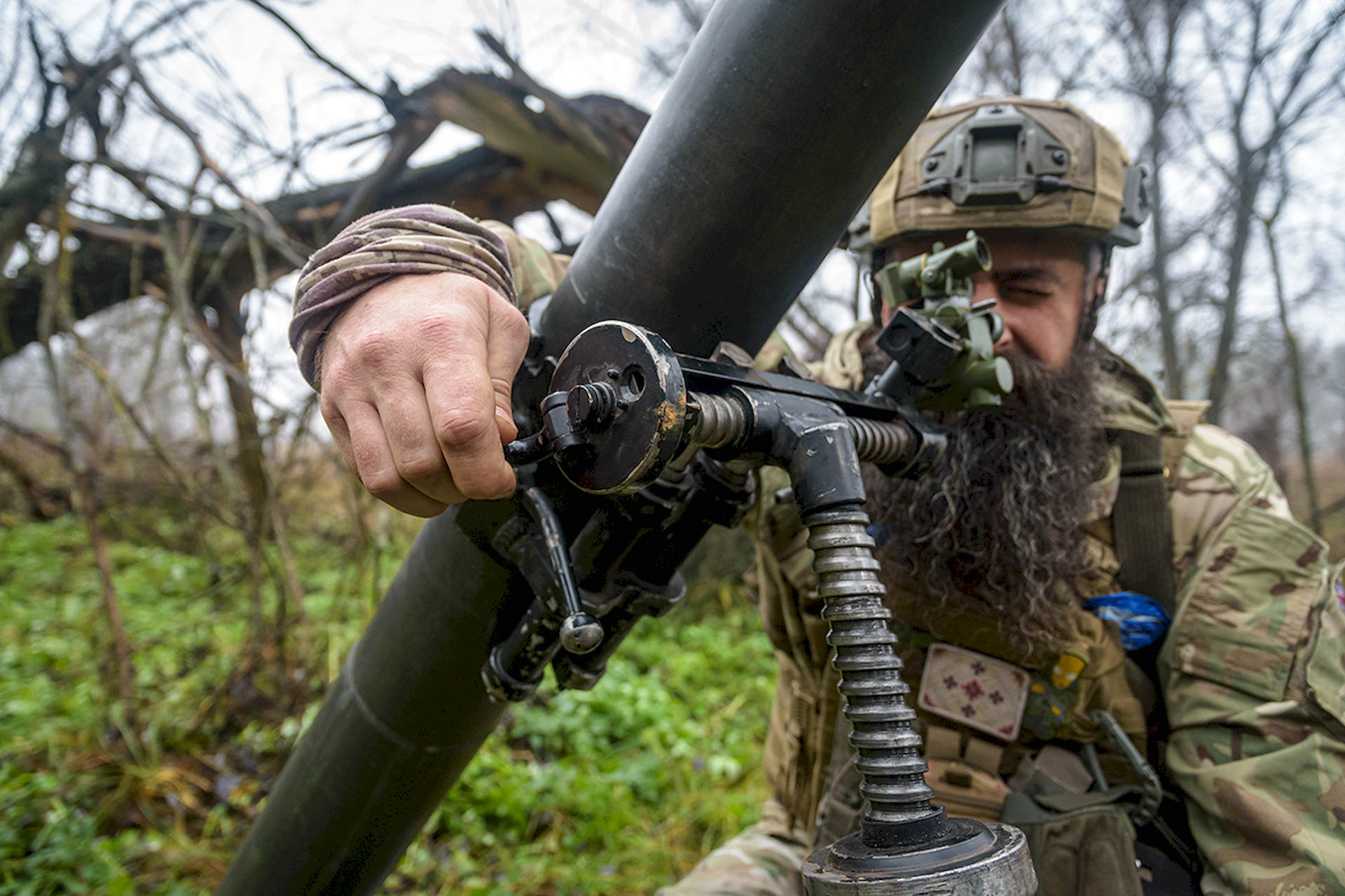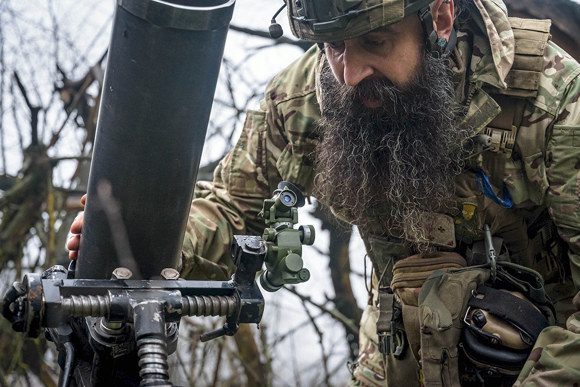 Молодший сержант з позивним Карамба наводить на ціль міномет М-74. Ця зброя не терпить помилок, тому від злагодженої роботи гвардійських розвідників, коректувальників і навідників залежить дуже багато.